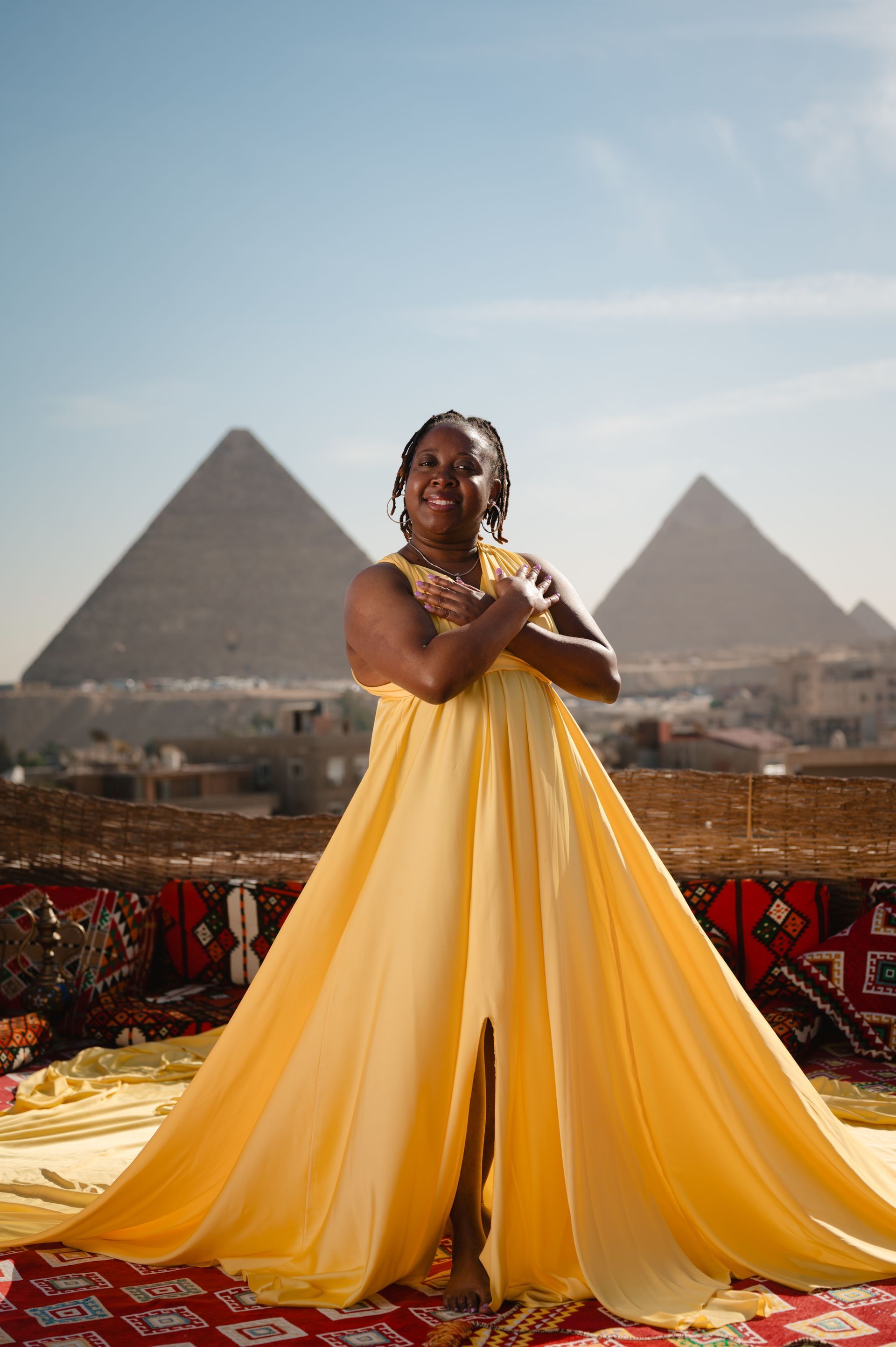 AIR planned an amazing flying dress photo shoot on Duo Pyramid Rooftop with Aurora's Flying Dress Egypt for all the ladies on the trip to celebrate one of our birthdays. The Aurora's Flying Dress Egypt provided the jewel-toned dresses, which we picked out in advance of the trip. We all felt like we were on an episode of Cairo’s Next Top Model! Lol. We had such a great time modeling for the camera! Of course, we ended the night with a rooftop dinner at Zeeyara Pyramids Elite with a perfect view of the pyramids.
